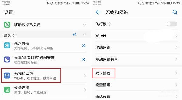 就会进入以下“双卡管理”页面,我们可以看到在顶端会显示有卡1和卡2分别是什么卡,比如下图绿豆这部手机的卡1为电信卡,卡2为移动卡。然后往下看【默认移动数据】的栏目,可以看到此时选中的是卡2,由此就可以知道现在正在使用的是卡2也就是移动卡的流量啦。