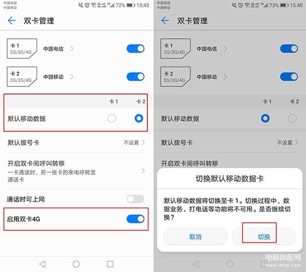 切换两张手机卡的上网流量同样在【双卡管理】页面进行设置,首先将底部的【启用双卡4G】打开,然后在【默认移动数据】选项根据自己的需求选择“卡1”或“卡2”,点击【切换】即可。