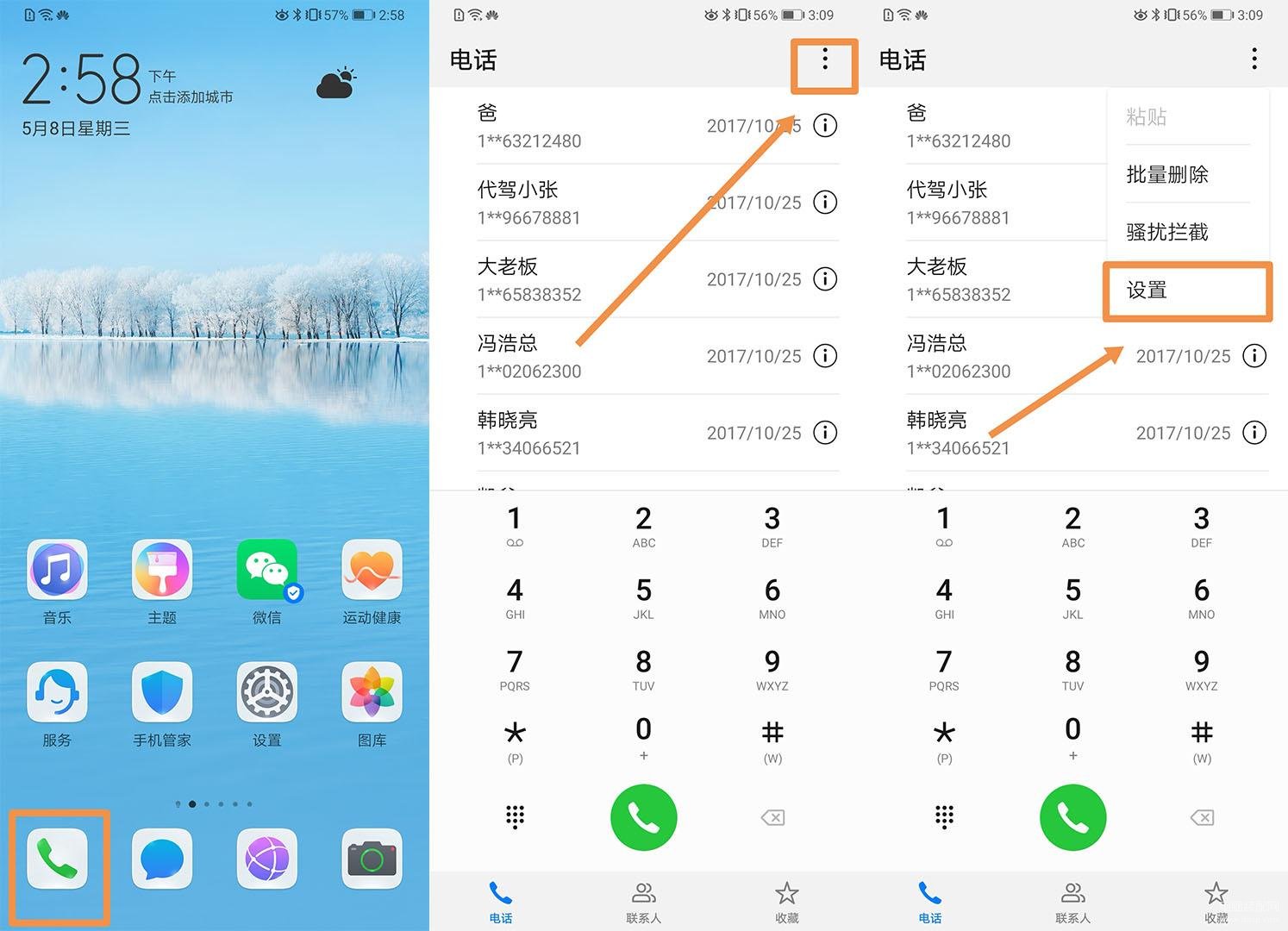 点击【电话】——【右上角的...】——【设置】