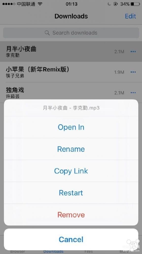 下载完成之后,在 Downloads 或者 Files 文件夹中找到目标音乐文件,并点击文面后面的省略号,在弹出的菜单中选择 Open In,然后将歌曲 Add to iCloud Drive。完成之后,音乐文件就导入 iCloud Drive 中备用了。