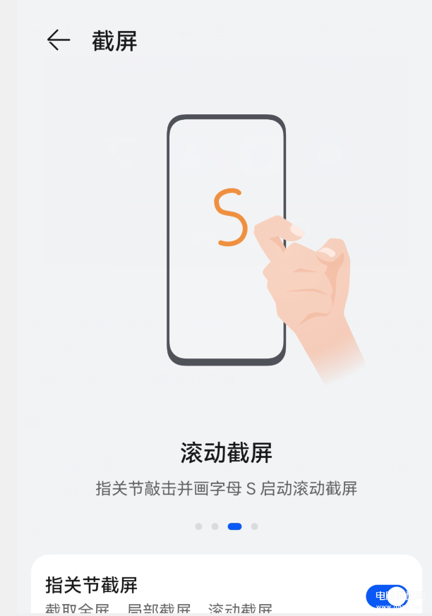 用手指的指关节在手机的屏幕上,从上到下画一个S,就可以对手机屏幕进行滚动截屏(或者叫长截屏)。这个功能对于页面比较长的网页,就非常有用了。同样,这种截屏方式也是需要打开指关节截屏开关,才能使用的。