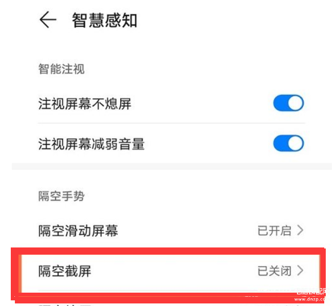 要想使用隔空截屏,也是需要先开启它。打开手机设置,点击“辅助功能”,再点击“智慧感知”。