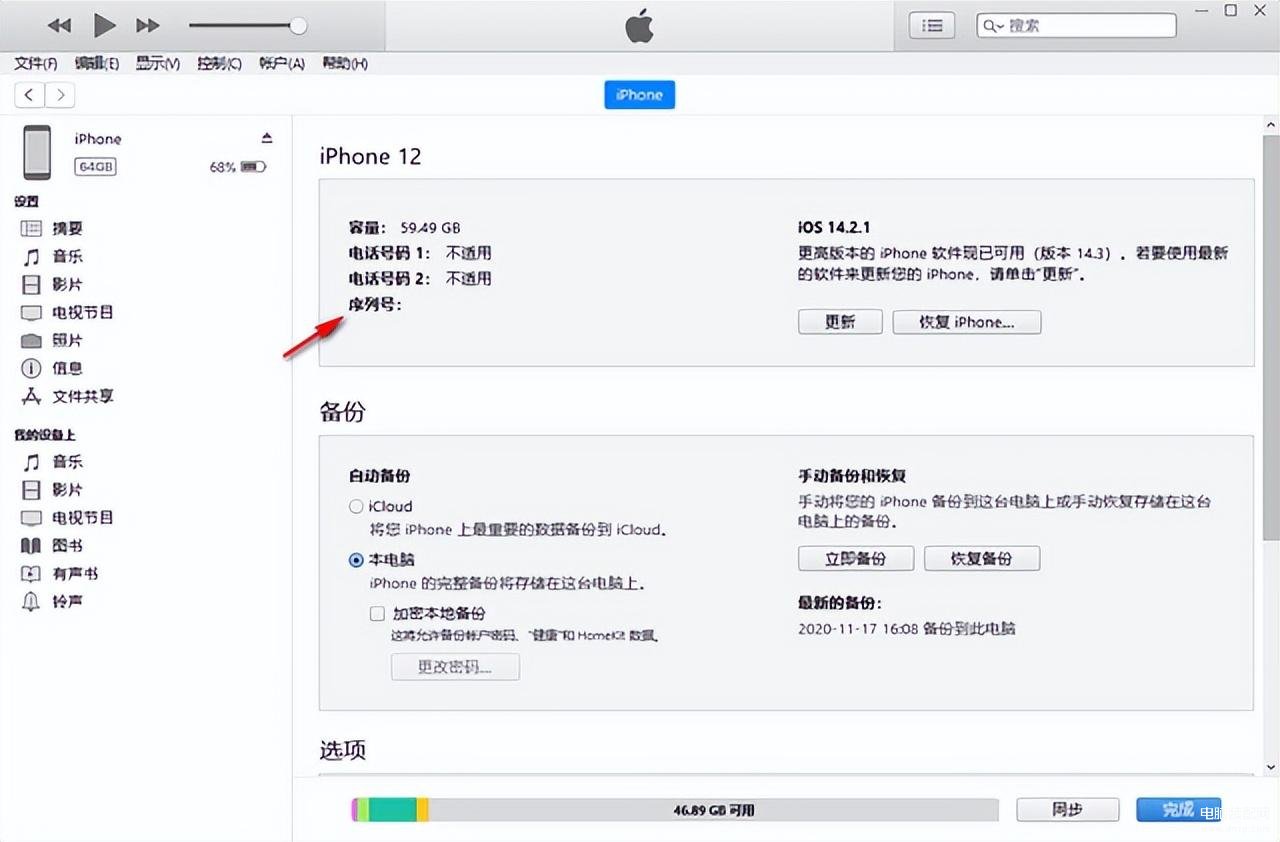 在电脑上下载安装最新版本的iTunes,使用数据线连接iPhone与电脑,待软件正常识别设备后,单击左上角苹果图标,即可查看设备的序列号以及其它相关信息。