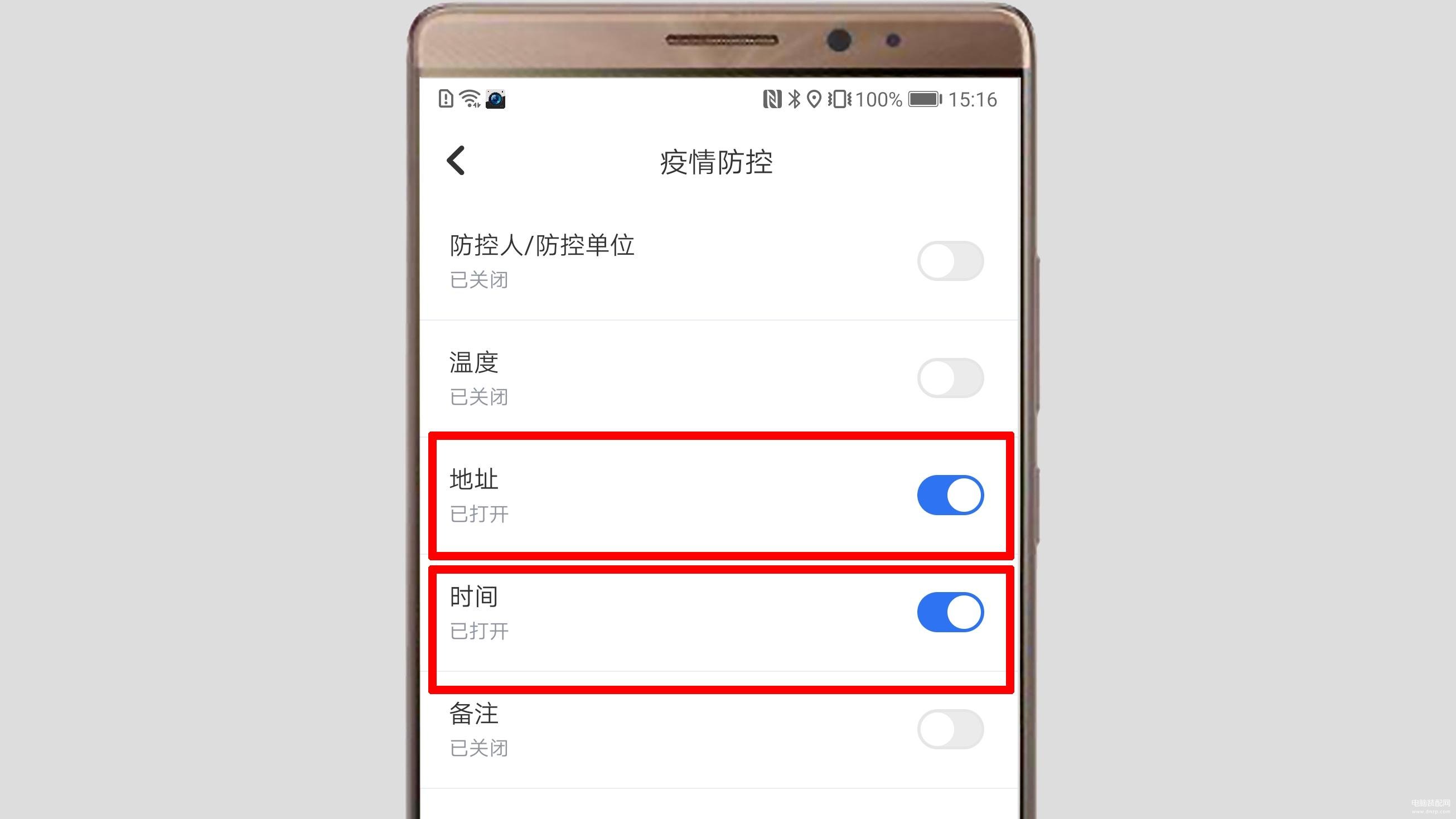 5、在水印编辑窗口,分别开启显示“地址”和“时间”,返回拍照界面,即可完成操作。