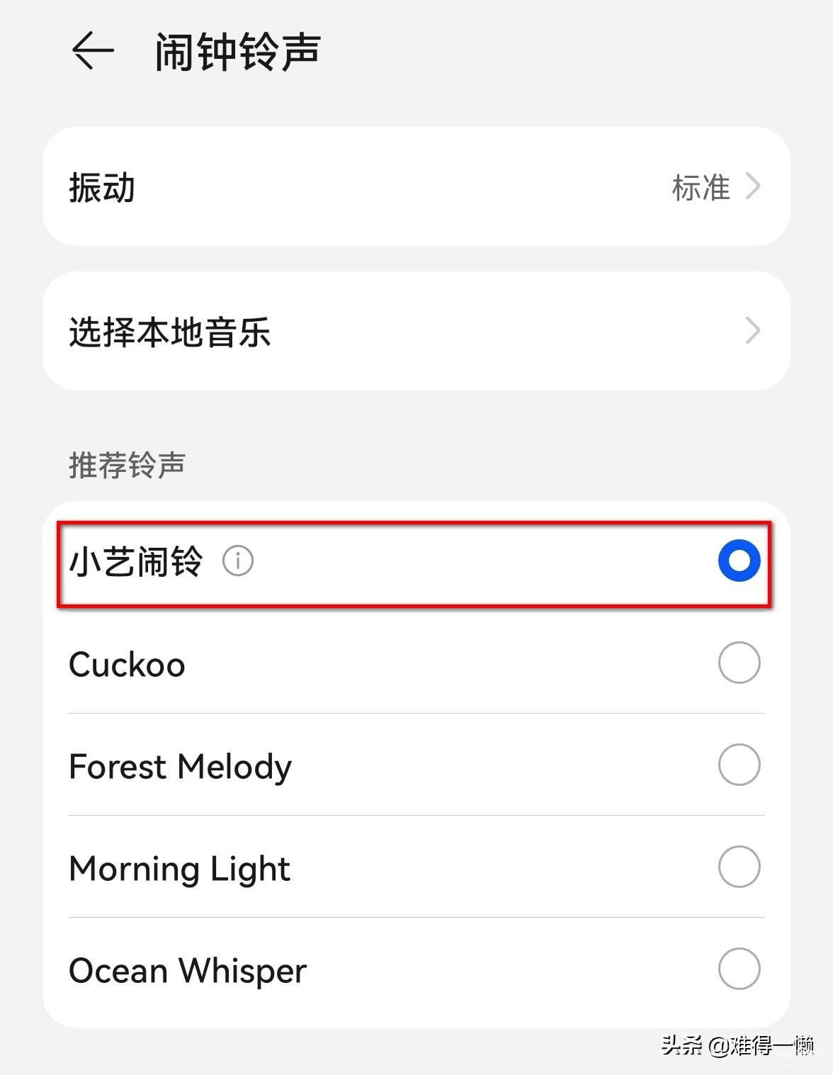 在闹钟铃声界面,选择勾选小艺闹铃。这个闹铃在响起时,小艺会播报当前的时间和天气。