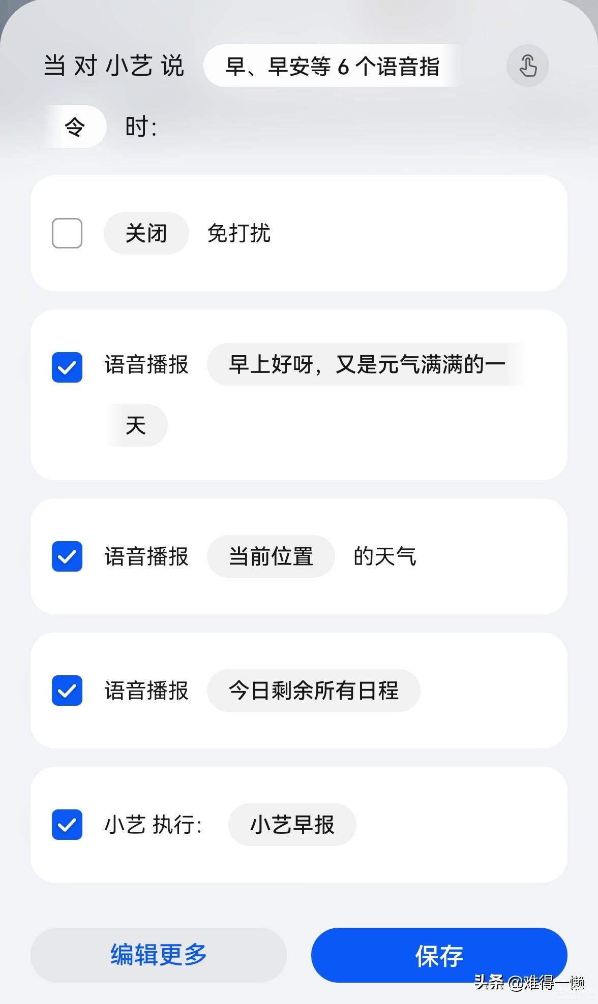 如果不需要这些功能,就是想听手机闹钟播报时间和天气情况。把闹钟铃声设置为小艺闹铃就可以了。至于更多的内容,需要开启智慧语音设置我的场景来实现。