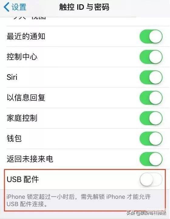 您还可以允许 iOS 设备始终访问 USB 配件:依次打开 iPhone “设置”-“触控 ID/面容 ID 与密码”,打开“锁定时允许访问”下方的“USB 配件”。