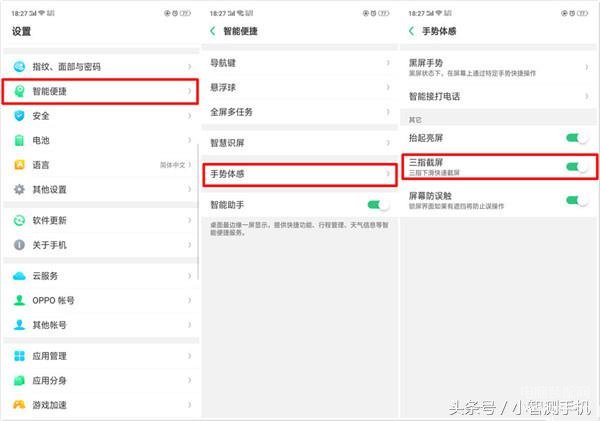 设置方法:设置——智能便捷——手势体感——三指截屏——开启