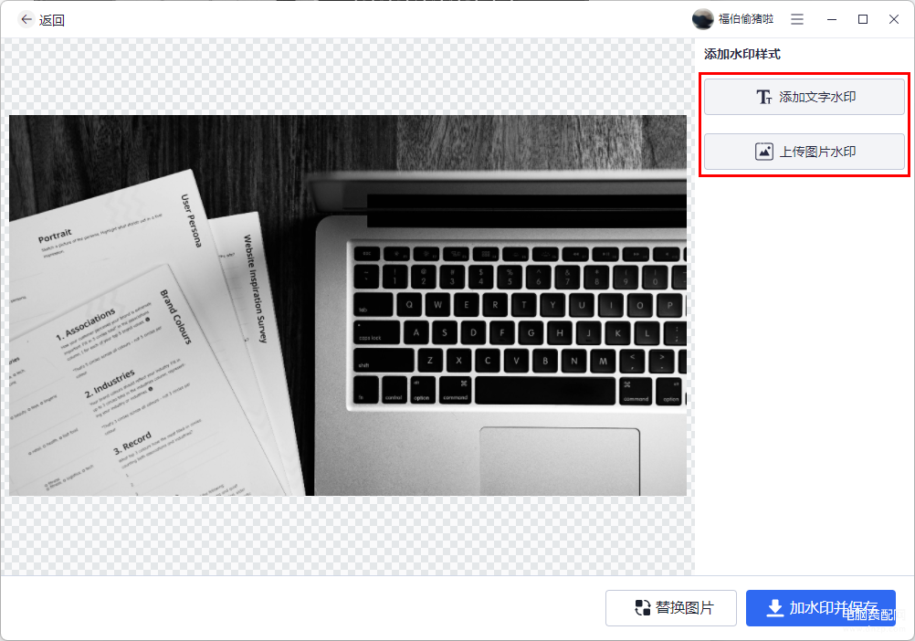 步骤三:水印设置好之后,点击右上角的【加水印并保存】就可以啦!下图分别是“加文字水印”和“加图片水印”的演示图。