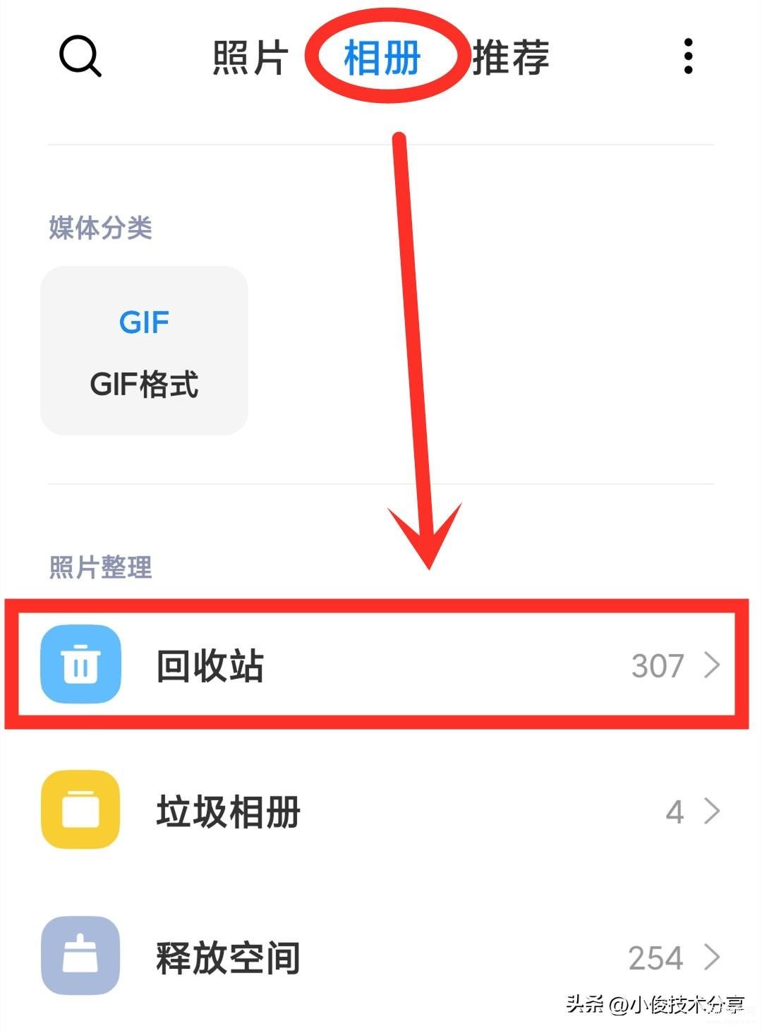 接着我们点击上方的【相册】,此时,我们在最下面就会发现一个【回收站】的选项了