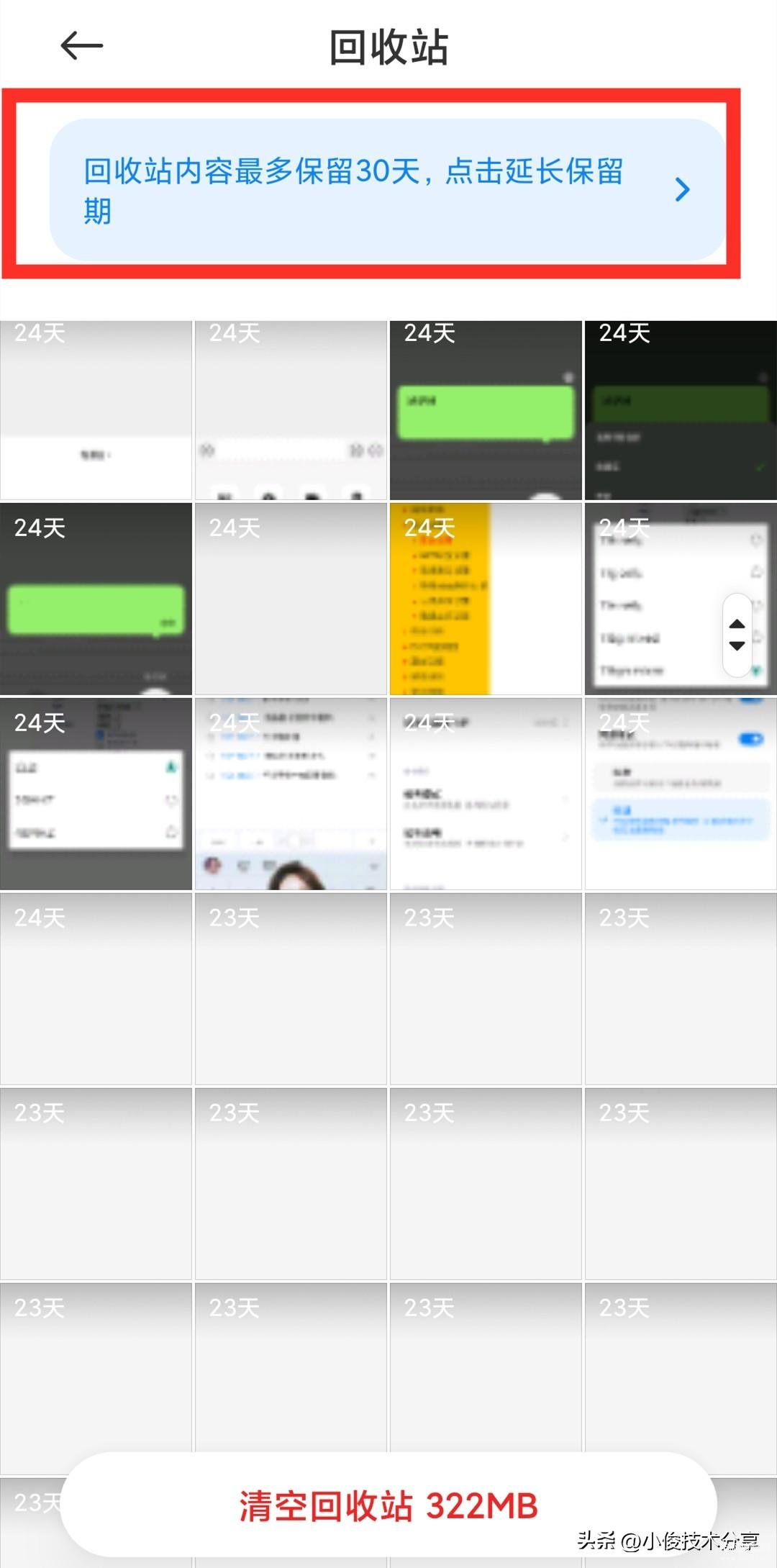 我们点击打开这个【回收站】,你会发现我们删除的照片全部都保存在这里了,而且有效时长为30天,也就是说,这些文件需要等到30天过后才会被彻底删除掉