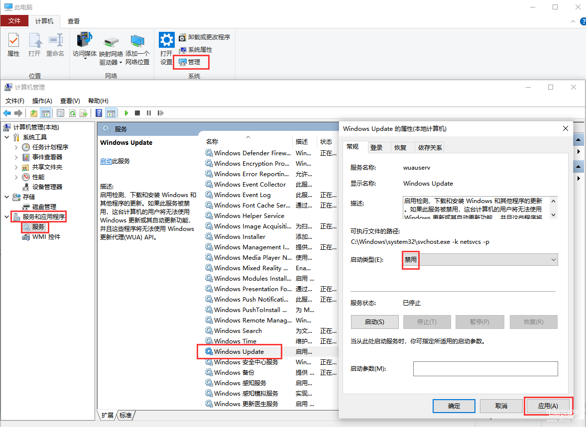 按下【Windows+E】,依次点击【管理】-【服务和应用程序】-【服务】-【WindowsUpdate】,单击鼠标右键选择【属性】,修改【启动类型】为【禁用】,然后点击【应用】即可。