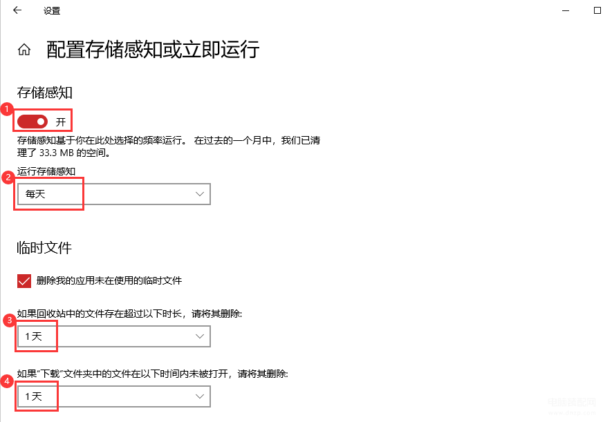 这里可以自定义每天、每周、每月自动清理,接下来勾选删除临时文件,将下面两个选项都设为【1天】即可,电脑就会定时自动清理垃圾啦。