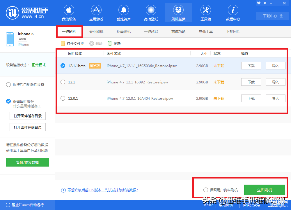 将iPhone通过数据线连接至电脑,在爱思助手【刷机越狱】-【一键刷机】页面,选择您需要的 iOS 版本,勾选【保留用户资料】刷机,爱思助手会自动下载固件并进行刷机。