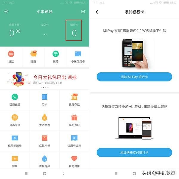 使用方法:打开手机的NFC功能,点击【小米钱包】-【银行卡】-【添加Mi Pay银行卡】,然后根据提示填写入相应的银行卡号、密码、手机号码等资料即可。