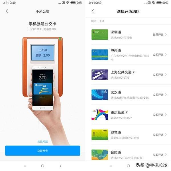 使用方法:点击【小米钱包】-【公交卡】-【立即开卡】,然后选择开通的地区,根据提示的步骤即可完成开通所选地区的公交卡、地铁卡。