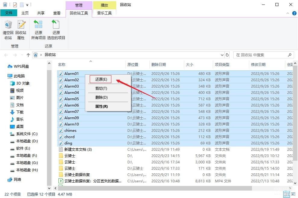 鼠标右键点击找到的录音文件选择“还原”,文件还原后会在初始位置显示出来,如你是在d盘删除的文件,即还原到原来的d盘位置。