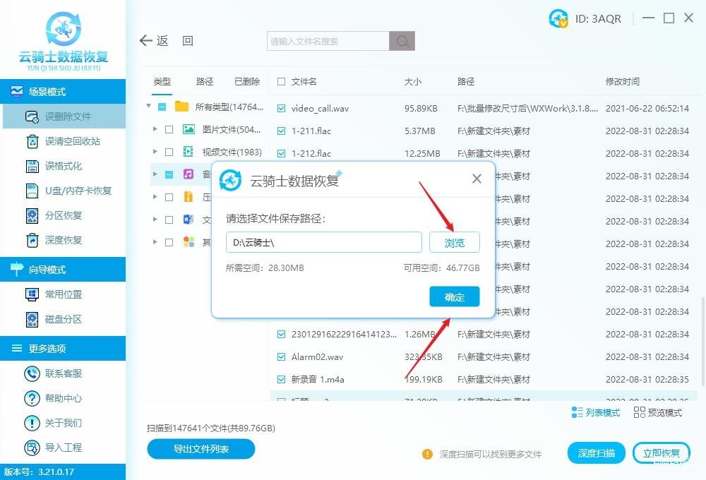 云骑士数据恢复是一款能够全方位解决数据丢失问题的软件,当你不小心误删除文件、清空了回收站亦是格式化了电脑硬盘/u盘/移动硬盘/内存卡等,它都能够轻松帮你找回各种格式的录音文件,如WMA、MP3、WAV、AIFF等,除此之外,恢复图片、视频、文档等文件类型也不在话下,而且软件不含任何插件广告,可放心下载使用。