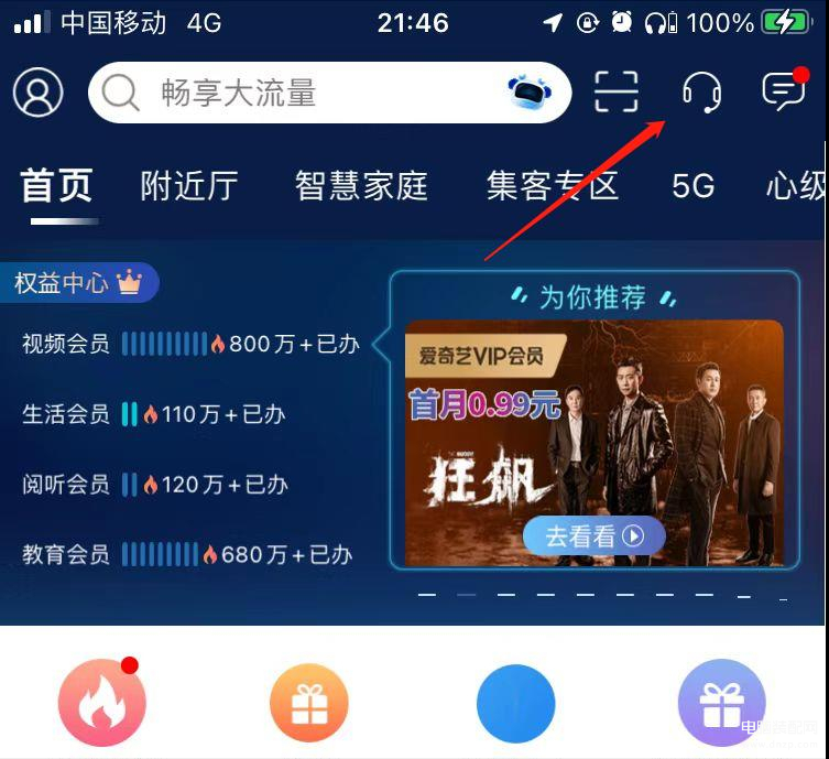 打开中国移动app后点击右上角按钮,输入8元自由选套餐语音包套餐