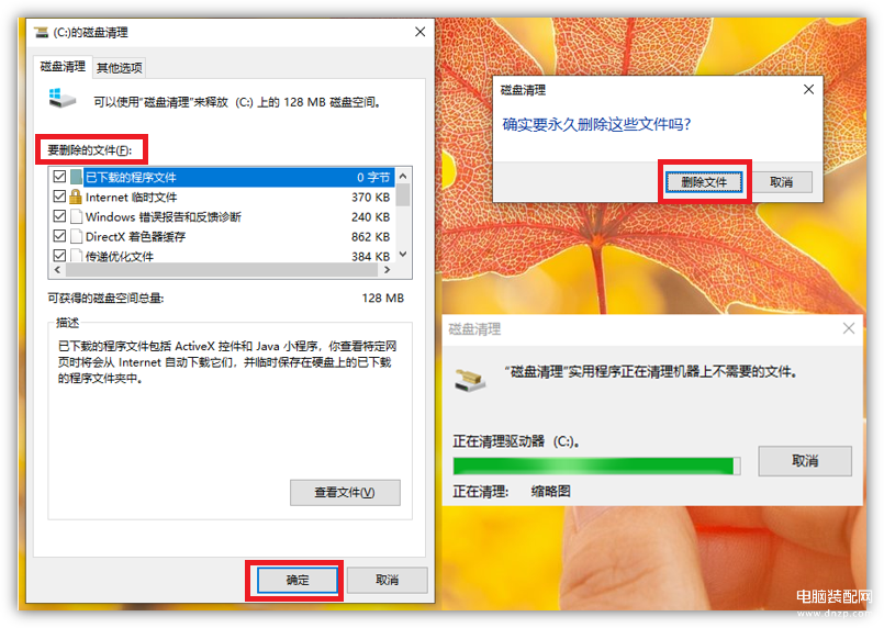 稍等几秒后,就会自动扫描出垃圾文件,勾选所有要删除的文件,点击【确定】按钮,选择【删除文件】,等待删除完成即可清理C盘空间。