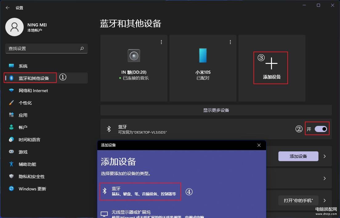 然后按Windows+I进入设置,打开蓝牙开关并点击添加设备,再点击蓝牙;