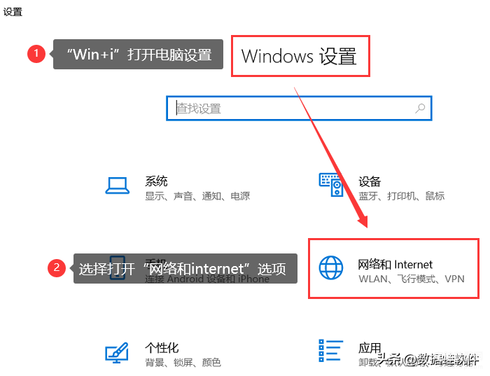步骤1:可以在电脑【开始菜单】中点击【设置】,从而进入Windows设置页面。这里还有一个更快捷的方法,就是按【Win+i】来直接打开。设置页面打开后,点击【网络和internet】;