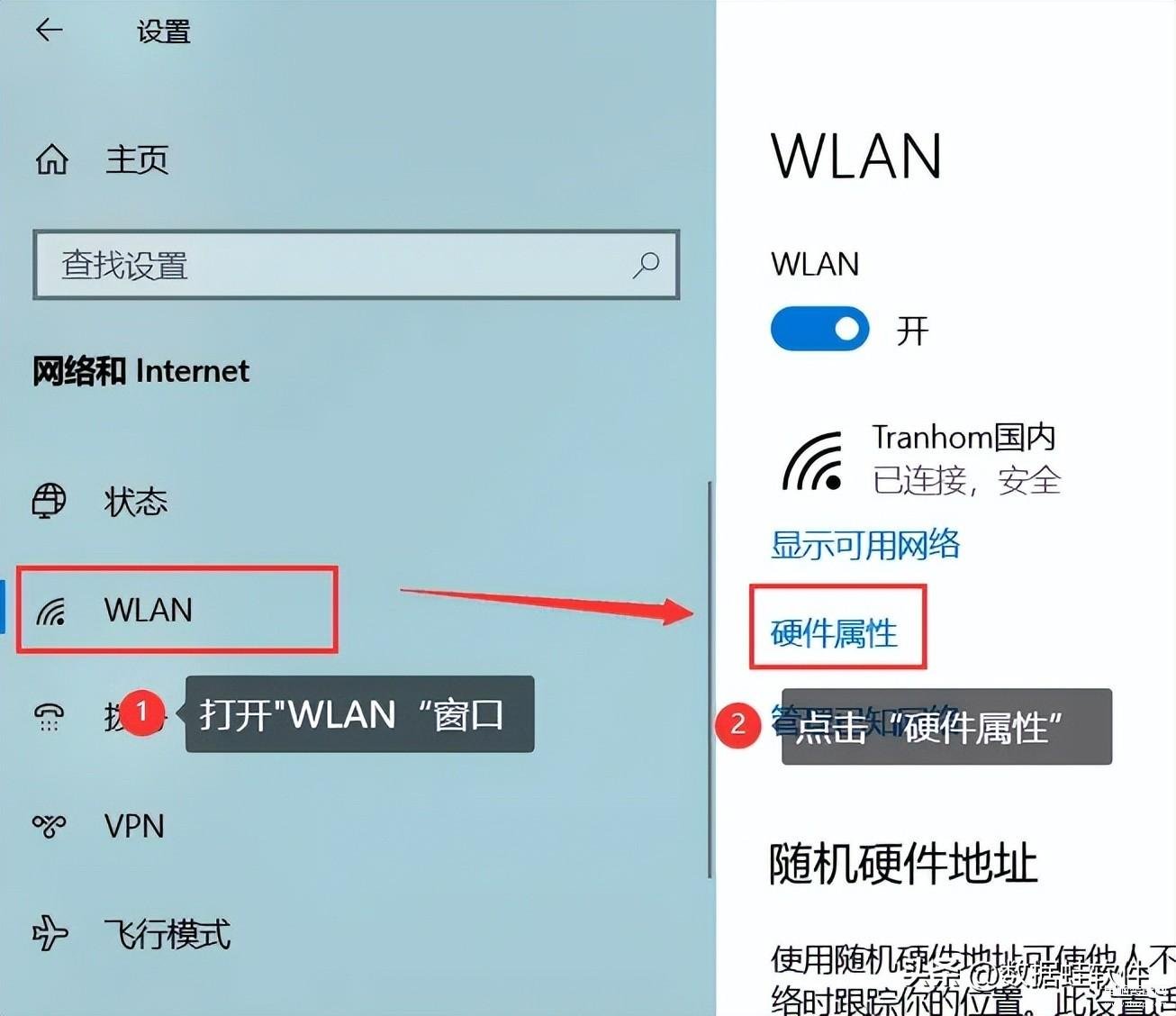 步骤2:此后,点击弹出窗口左侧的【WLAN】,选择【硬件属性】;
