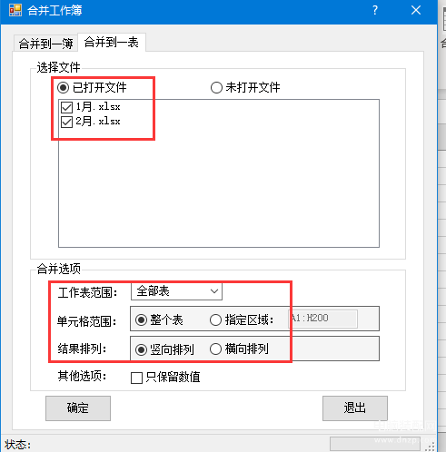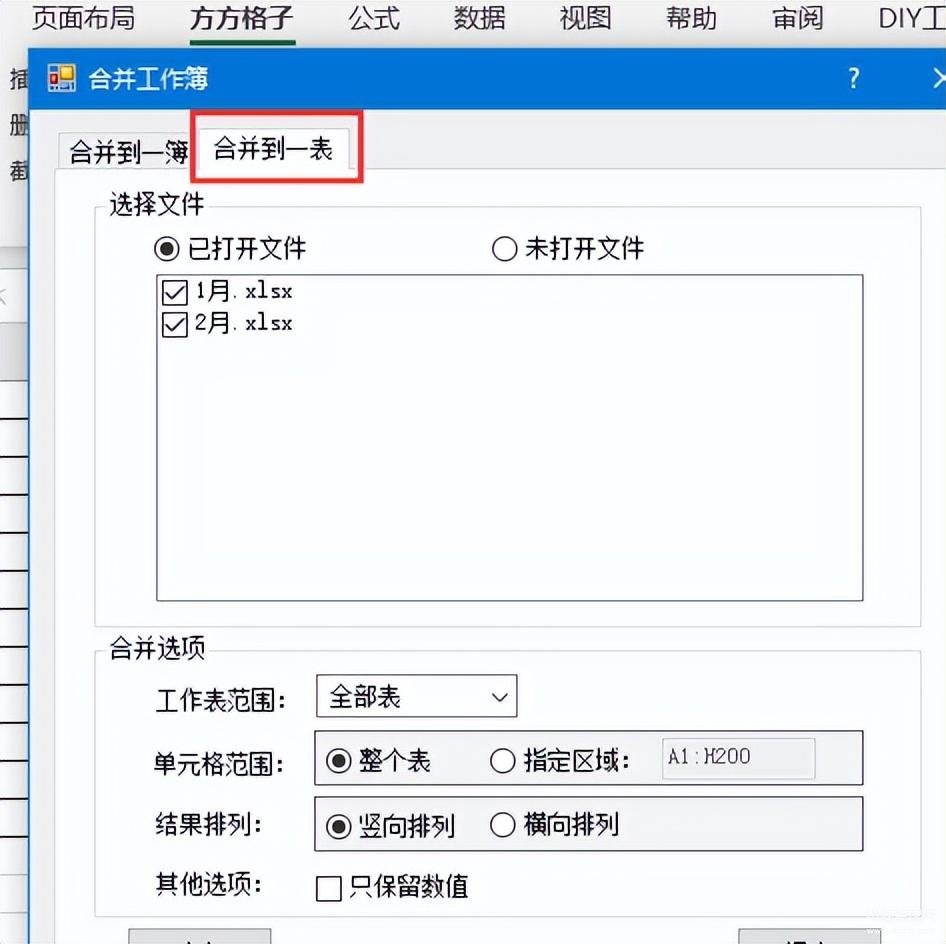 6.勾选【已打开文件】选择工作簿,然后根据需求设置【工作表范围】、【单元格范围】及【结果排列】本文这里就选择默认设置。