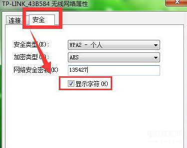 6、打开的界面中,选择“安全”项,勾选“显示字符”就可以看到wifi密码了,如下图所示: