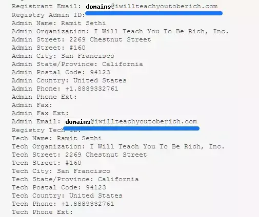 一些文章建议搜索目标网站的WHOIS记录,以找到他们的电子邮件地址。例如,在WHOIS中输入IWillTeachYouToBeRich.com,显示出来的是这样的: