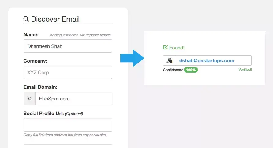例如,如果你想与HubSpot的Dharmesh Shah取得联系,你可以尝试使用DShah@HubSpot.com这样的电子邮件。