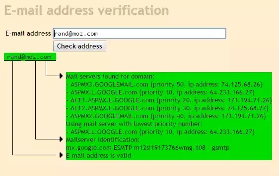 要使用它,请插入正在测试的电子邮件并单击Check Address。如果电子邮件存在,您将看到如下内容: