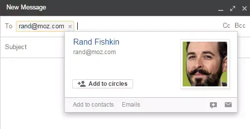 另一种通过Gmail/Google+实现此目的的方法是使用Rapportive。它的工作原理是一样的:输入一个猜测的电子邮件地址,它将在侧栏中显示相关的社交媒体简介。