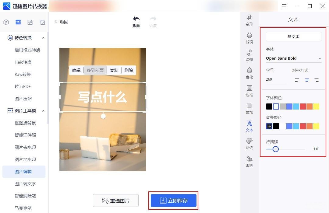 步骤二:将需要编辑文字的图片导入到软件里面后,就可以开始对图片添加文字,按照自己的想法给文字的字体颜色、背景颜色、行间距等进行调整,让文字看起来更加美观。如果大家编辑完文字还想进行其他操作,这个图片编辑工具里面还给大家提供了图片裁剪、贴纸、虚化等一系列修饰图片的功能,可以满足大家的多种需求。