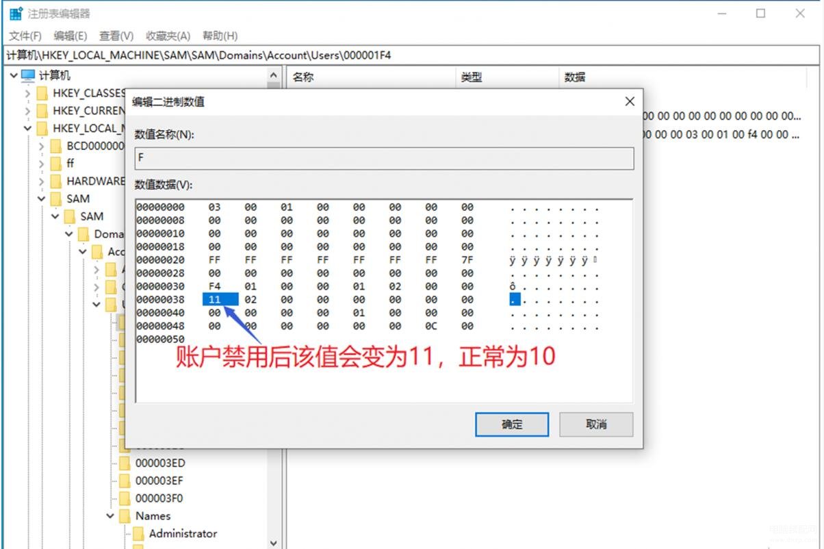 按提示将加载项的名称设置为cfan,接着展开[计算机\HKEY_LOCAL_MACHINE\cfan\SAM\Domains\Account\Users\000001F4],根据图1的提示,将其中“F”项下“0000038”对应的值由“11”更改为“10”。最后点击“文件→卸载配置单元”,完成键值的修改。