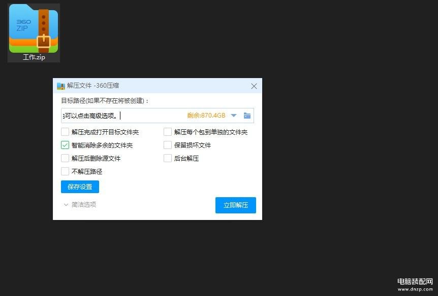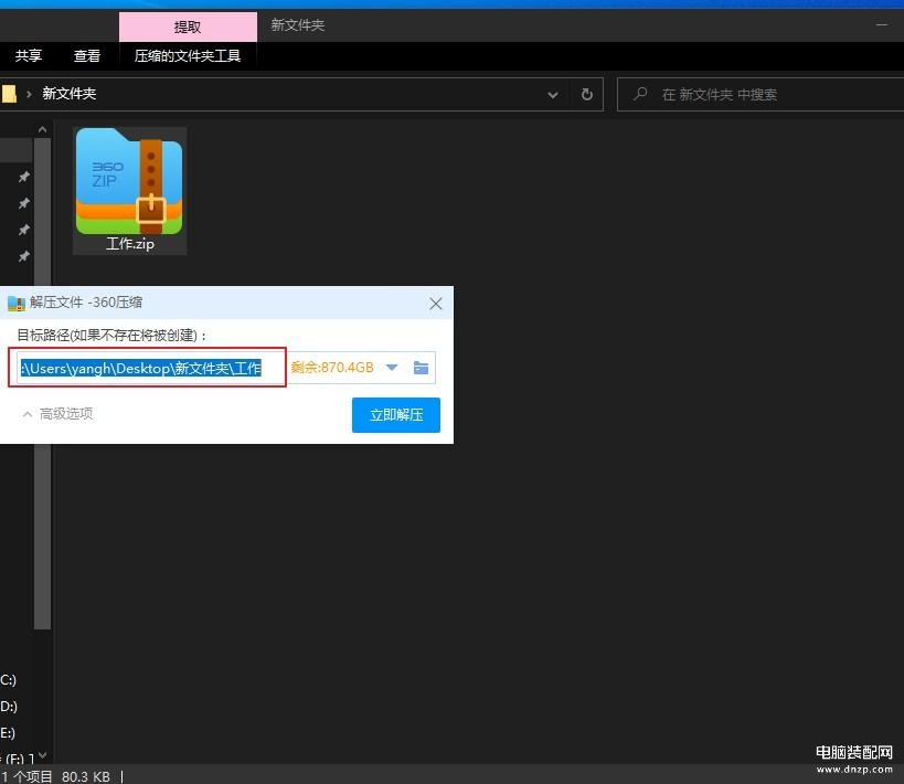 第二步:弹出【解压文件】对话框,在红框内输入需要解压的路径,或者直接选择文件夹进行解压。选择完成后点击【立即解压】按钮。