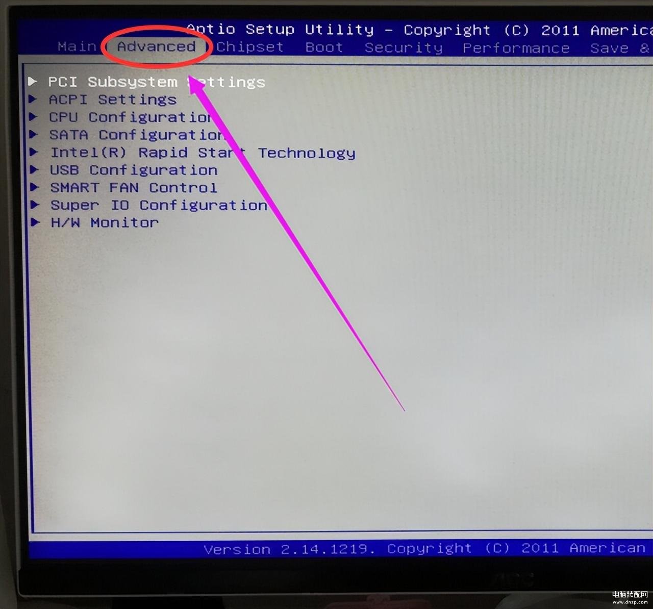 (2)然后通过键盘上的左右键选择“advanced”选项。