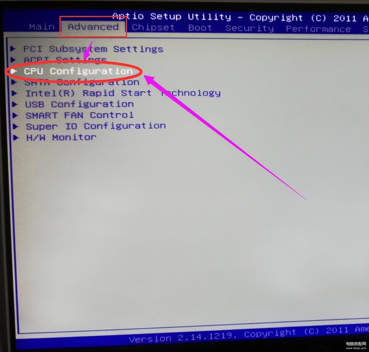(3)打开advanced以后,再通过键盘上的上下键选择“CPU Configuration”选项后,按下回车键。