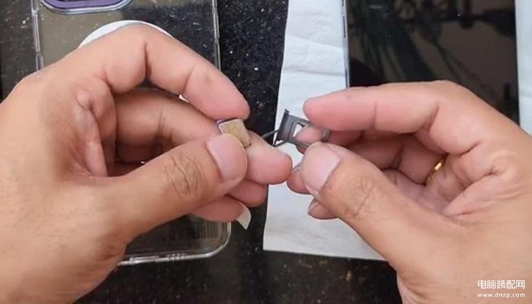 1、首先从iphone 14包装盒里取出卡针,将卡针垂直插入iPhone14左侧卡槽旁边的小孔中,微微用力一顶即可弹出SIM卡槽,之后将其轻轻抽去,取下即可,如下图所示。