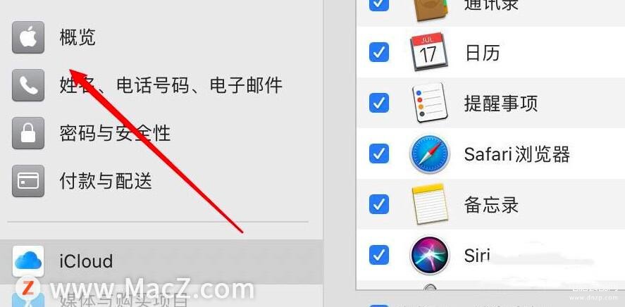 3、进入Apple ID设置界面,点击左边列表里的概览;
