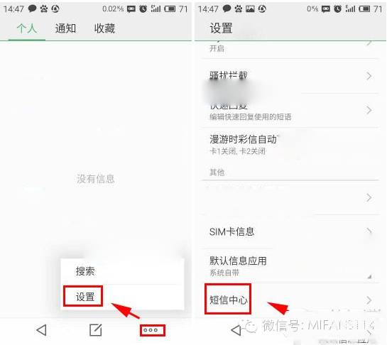 我们进入手机【信息】界面,点击右下方的【。。。】后选择【设置】,进入【短信中心】。