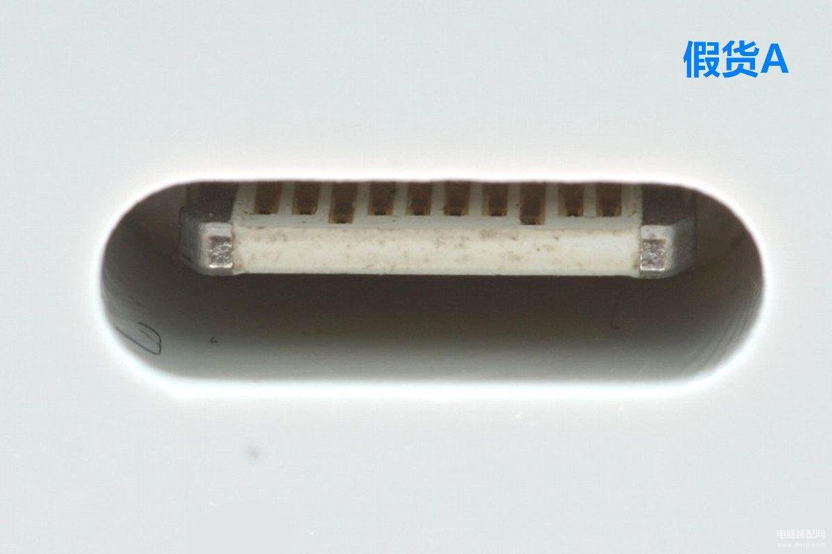 这是假货 A 的 USB-C 接口微距图,母座物料跟苹果正品完全不同,一眼就能看出是假货。