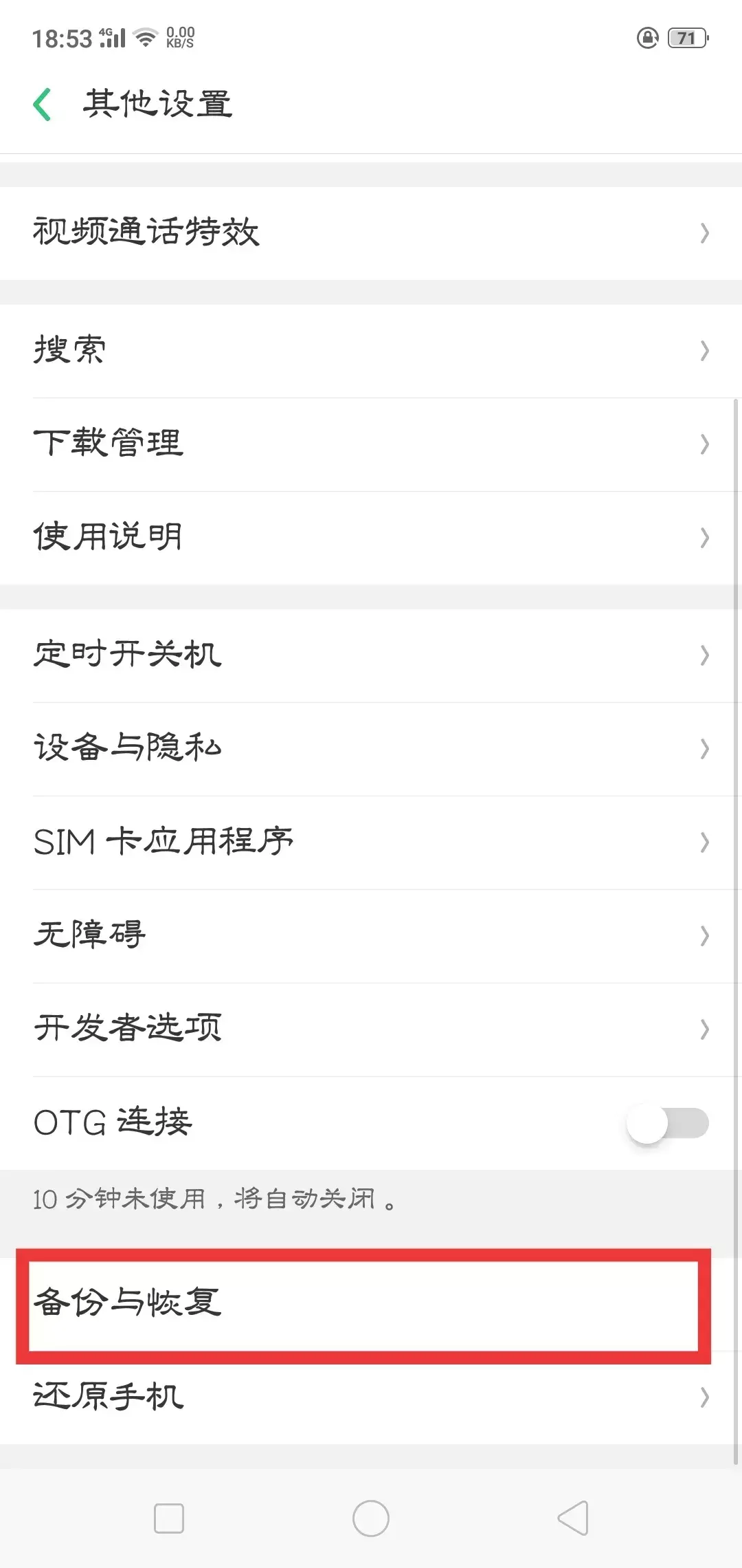 进入设置—其他设置—备份与恢复—新建备份—备份(ColorOs 5.0以前的版本,在工具—备份与恢复—新建备份—备份)选择完成后拷贝至其他存储设备保存;