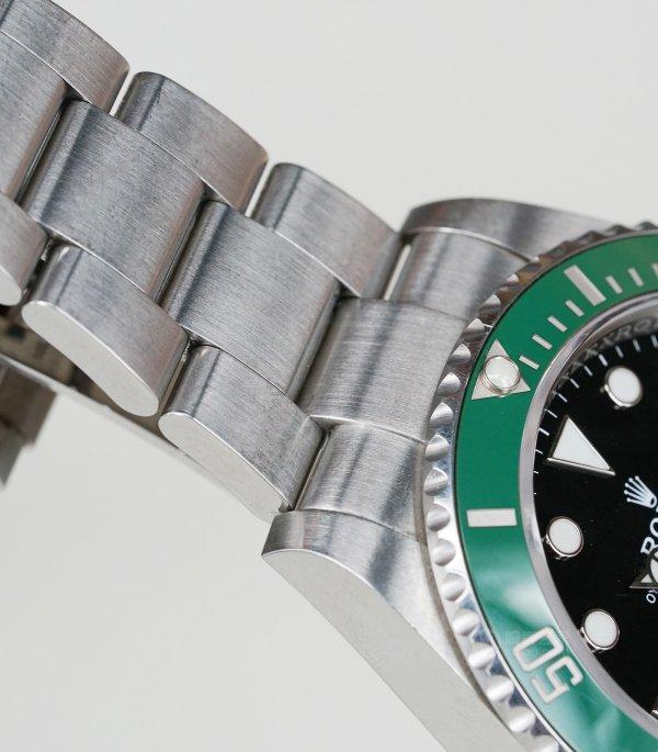 但是,新款水鬼,包括这只三代绿鬼126610LV在内,表壳造型的变化,是非常明显的。我们可以看到,手表的表耳,变细并拉长,表壳显得更窄一些。而上一代水鬼的表耳很宽,表壳显得更方一些。 在表壳处理上,三代绿鬼126610LV和过去的水鬼一样,表壳正面全部拉丝,而表壳侧面全部抛光。侧面全部抛光,是劳力士运动表的一大特征,在其他名表品牌的运动表中,比较少见。