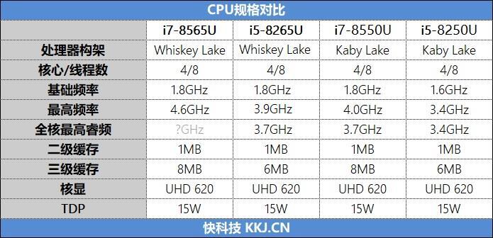 新构架最大的不同就是在TDP保持不变的前提下,频率获得了大幅度提升,从而使性能得到了相应的提升。i7-8565U最高频率达到了前所未有的4.6GHz,i5-8265U的最高频率也达到了3.9GHz,相比i5-8250U的3.4GHz足足提高了500MHz。