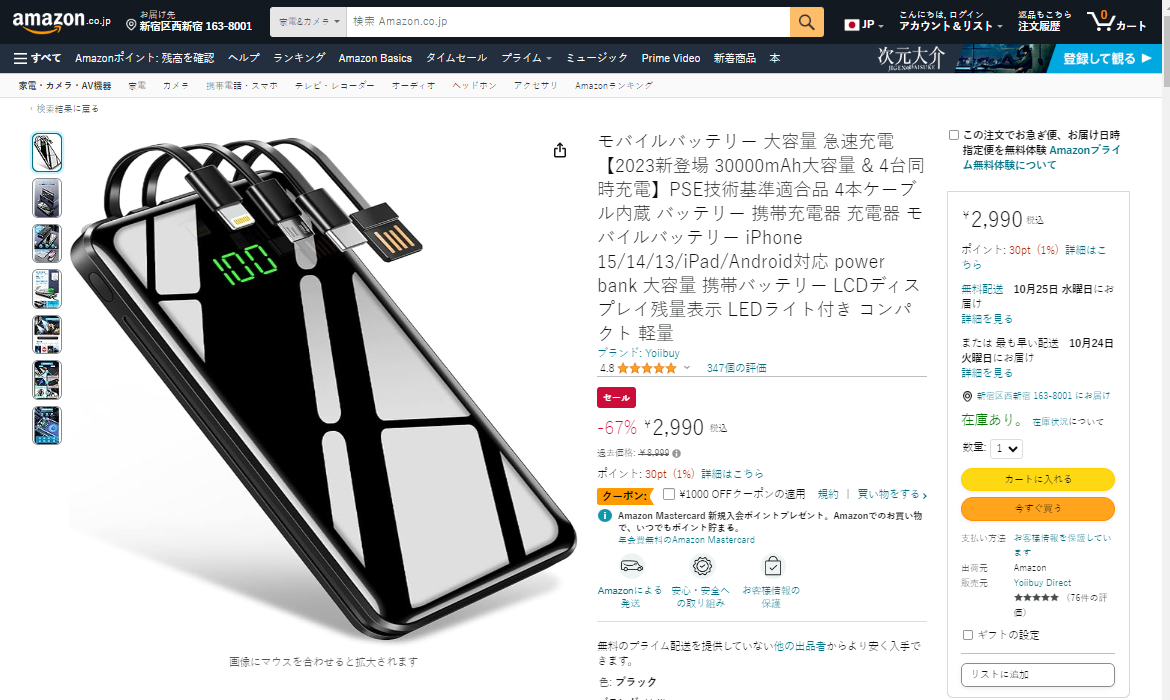 榜单第七名是Yoiibuy的モバイルバッテリー 大容量 急速充電,容量为30000mAh,售价2990日元,评分4.8分,评论数347条。