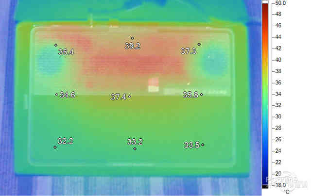 测试环境温度在18℃上下,在运行测试软件及测试游戏30分钟后,我们使用FLUKE红外热成像仪,分别观察各个位置的温度情况。(温度跨幅18°C-50°C:低于温度下限会显示黑色;超过温度上限会显示白色)。