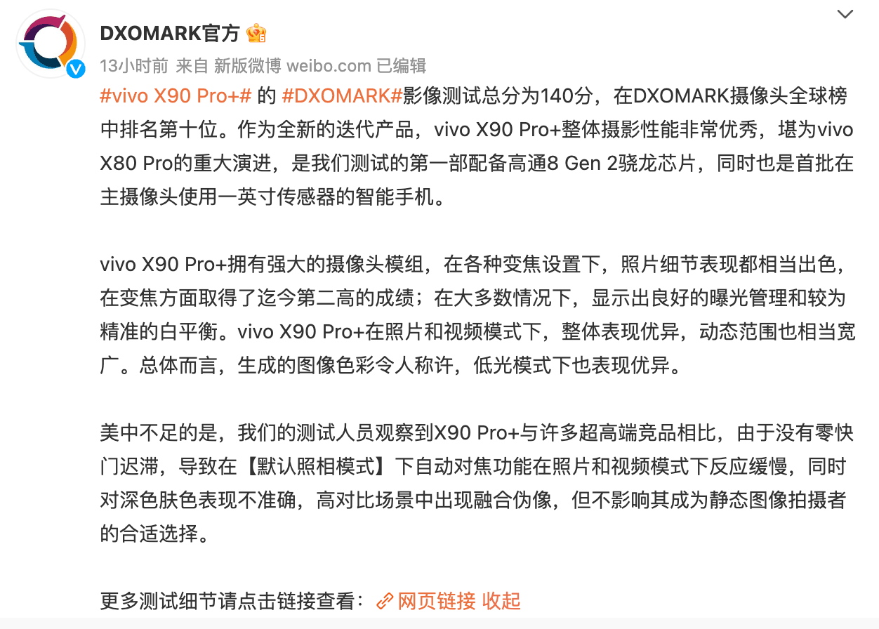 2023 年 1 月 31 日消息,DXOMARK 公布了 vivo X90 Pro+ 的相机评分,总分 140 分,与 Google Pixel 7 并列排名第 10,目前榜单第一仍旧是 IMX766 的华为 Mate 50 Pro 149 分。