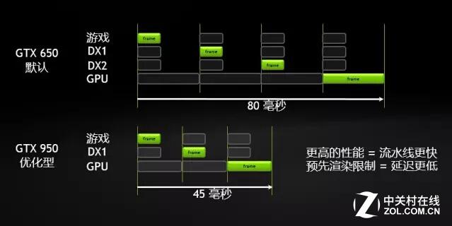 对于MOBA类游戏,响应速度非常重要。在网络环境和电脑配置足够的情况下,显卡默认采用的预渲染机制将成为增加延迟的最主要因素。所谓预渲染就是将游戏的下一帧画面提前渲染,可以提升游戏帧数,但会增加延迟。GTX950结合最新版GeForce Experience一键优化,可以将两帧预渲染画面减少为一帧,从而大幅降低延迟。