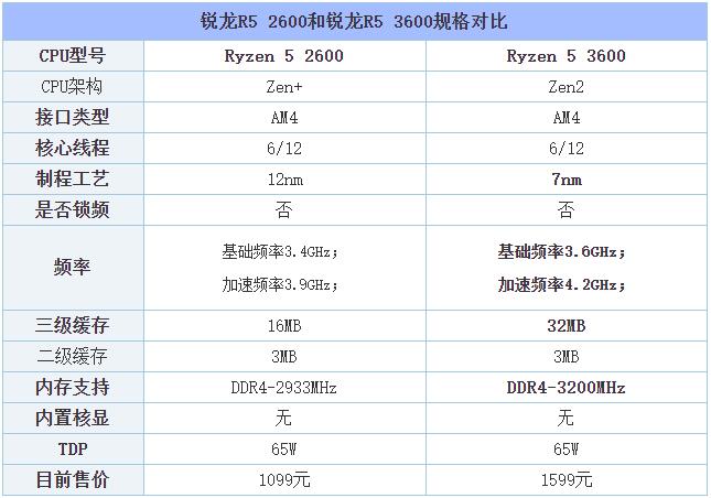 从规格上来看,Ryzen5 3600相比Ryzen5 2600主要在制程工艺、频率、三级缓存以及内存支持上有着较大的改进,不过在目前售价上,由于新上市缘故,R5-3600要比上一代R5-2600贵了500元。
